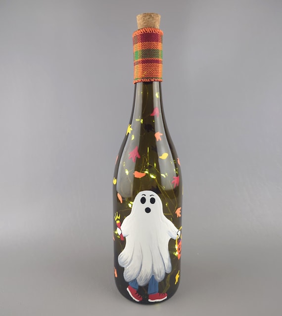 Halloween Trick or Treating Ghost Lighted Wine Bottle - Hand Painted - Upcycled, Recycled - Fairy Lights