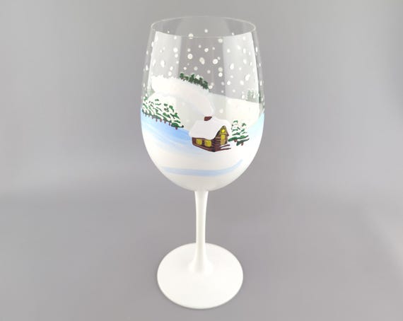 Winter Cozy Cabin Snow Scene - Stemmed Wine Glass - Hand Painted - Pine Trees, Cabin, Snowflakes