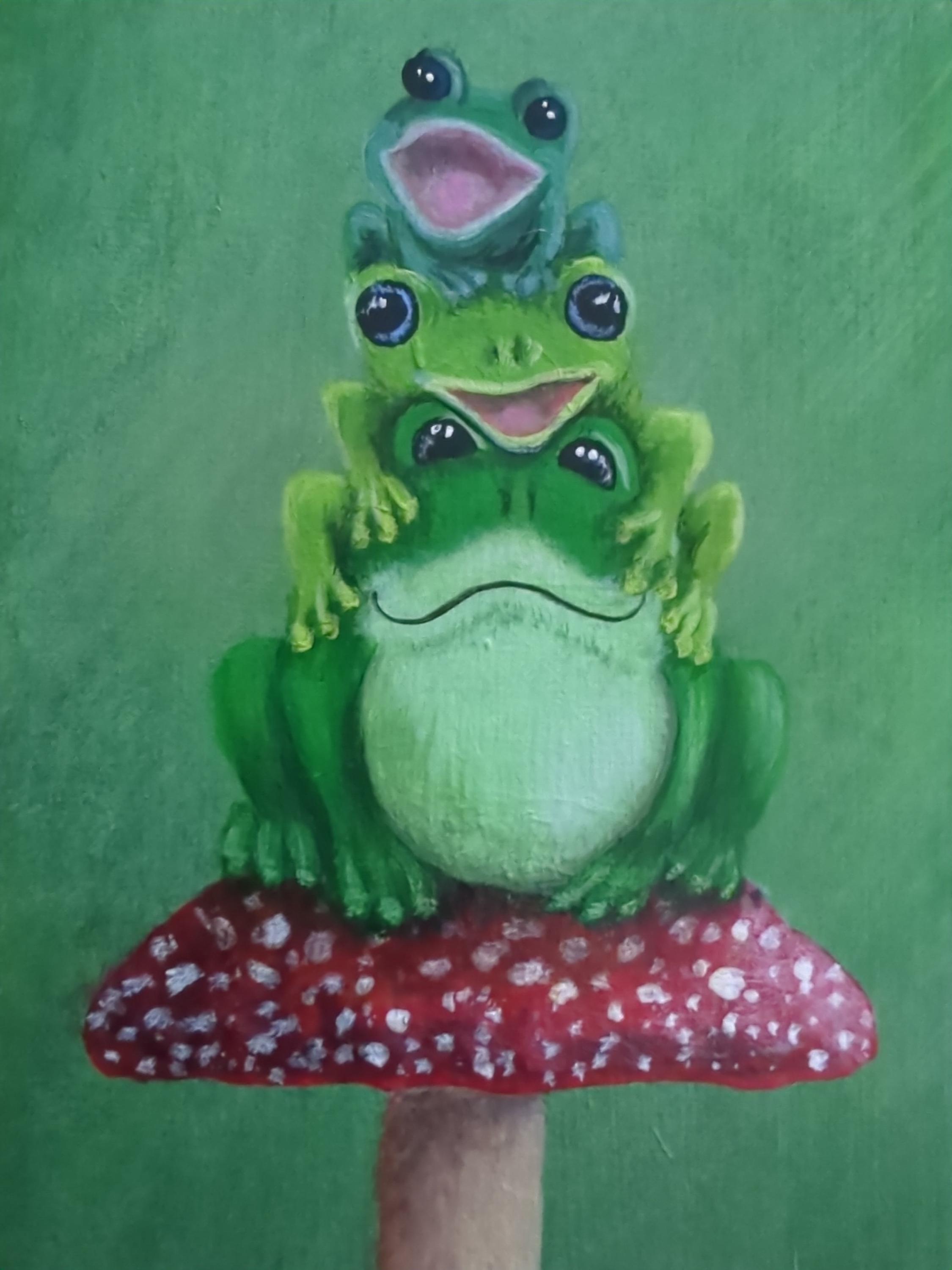 The natural grain of the wood becomes part of the setting, grounding the composition while allowing the movement and energy of the frogs to stand out. It feels both joyful and centered at the same time.